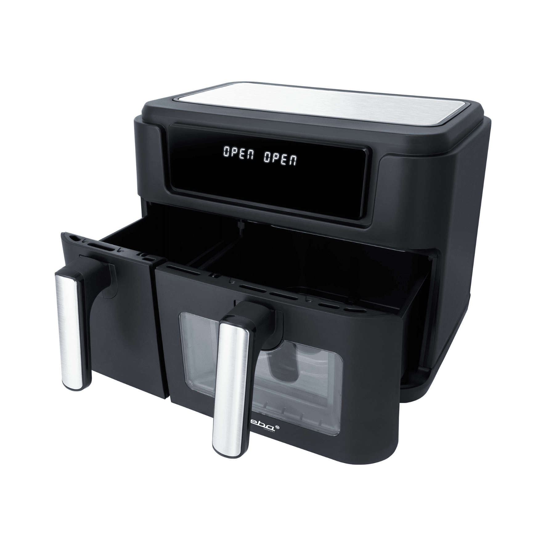 Mit der Steba Heißluft-Fritteuse HF 9500 DUO werden Pommes & Co. im Handumdrehen zum gesunden Fast-Food – außen knusprig, innen zart! Das Beste dabei: Die Heißluft-Fritteuse ist ein kompakter Allrounder, der gleich mehrere Funktionen in einem vereint. Egal ob frittieren, kochen, backen oder grillen – mit der HF 9500 DUO können sogar Pizza und Brathähnchen, aber auch Brötchen und Kuchen zubereitet werden! Zwei PFAS-freie antihaftbeschichtete Frittier-Behälter bietet genügend Platz (insgesamt 9,5 l) für große Portionen für die ganze Familie. Wer kleinere Portionen zubereiten möchte, kann aber auch einfach nur den kleineren Behälter mit 3,5 Liter nutzen.