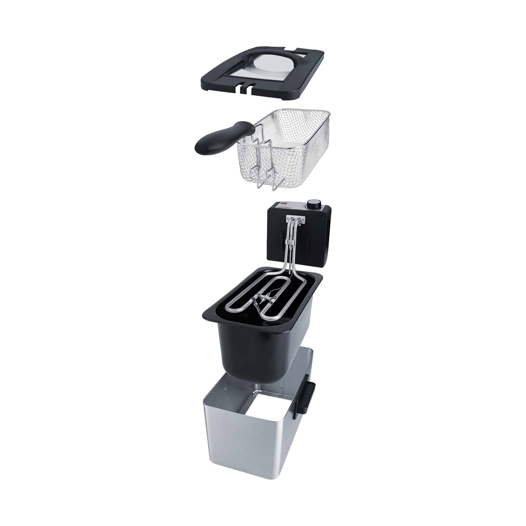 Die kompakte Edelstahl-Fritteuse DF 180 fasst 3 Liter Öl und bietet damit Platz für bis zu 1 kg leckerem Frittiergut. Pommes, Chicken Nuggets und Calamari gelingen mit dem Profi-Heizsystem der Kaltzonen bei bis zu 190°C immer optimal – ohne Anbrennen, da die Hochleistungs-Heizelemente frei im Öl liegen! Dadurch ist der Topfboden kühler als oberhalb der Heizstäbe (hier liegt das Frittiergut). Fällt ggf. Frittiergut durch den Korb verbrennt es nicht mehr auf dem Topfboden. Das spart viel Zeit bei der Reinigung. Die Kaltzonenfritteuse ist komplett zerlegbar. So kann das Frittierfett bei Bedarf in ein Aufbewahrungsgefäß gegossen und alle Bestandteile der Fritteuse einfach gereinigt werden.