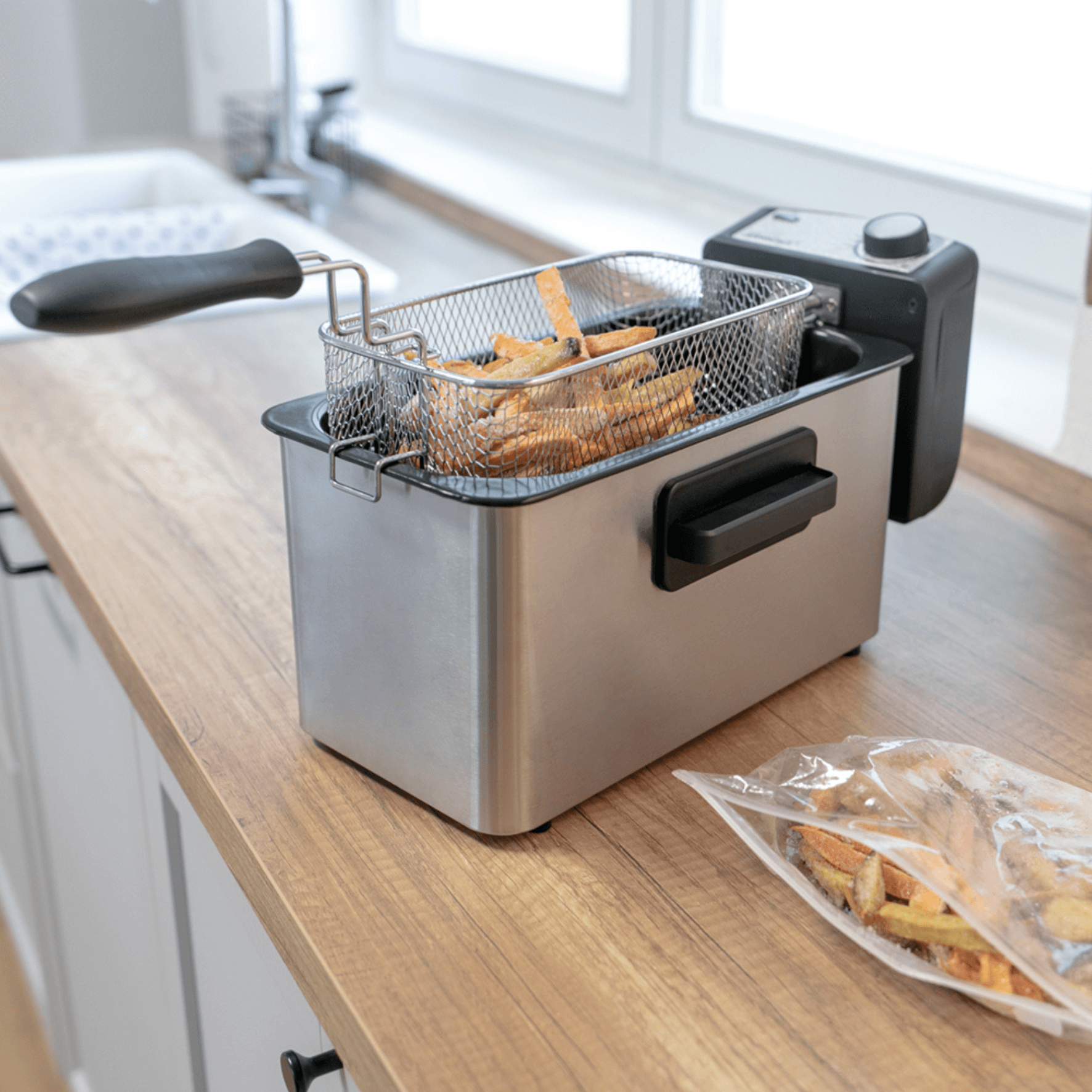 - Für bis zu 1,0kg Frittiergut (optimal: 600g)