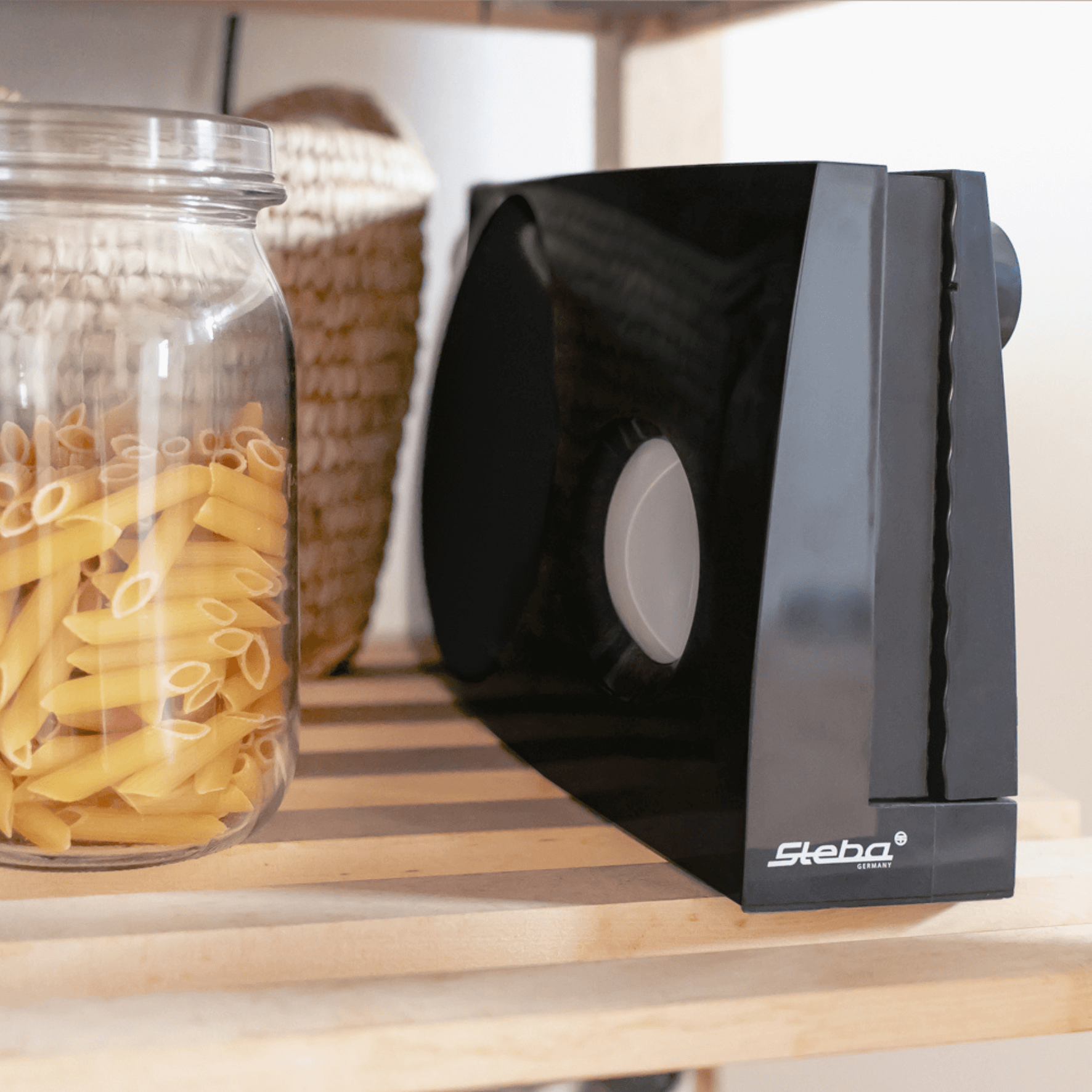 Der Steba Allesschneider AS 100 kann eingeklappt (20 x 9,5 x 33 cm) werden und passt problemlos in jeden Küchenschrank. Auf diese Weise eignet er sich für den Gebrauch in kleinsten Küchen und belegt nicht dauerhaft wertvollen Arbeitsplatz.