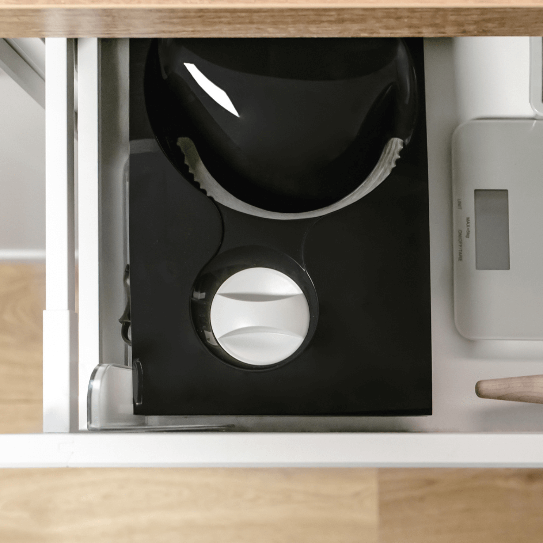 Der Allesschneider AS 100 kann eingeklappt (20 x 9,5 x 33 cm) werden und passt problemlos in jeden Küchenschrank. Auf diese Weise eignet er sich für den Gebrauch in kleinsten Küchen und belegt nicht dauerhaft wertvollen Arbeitsplatz.