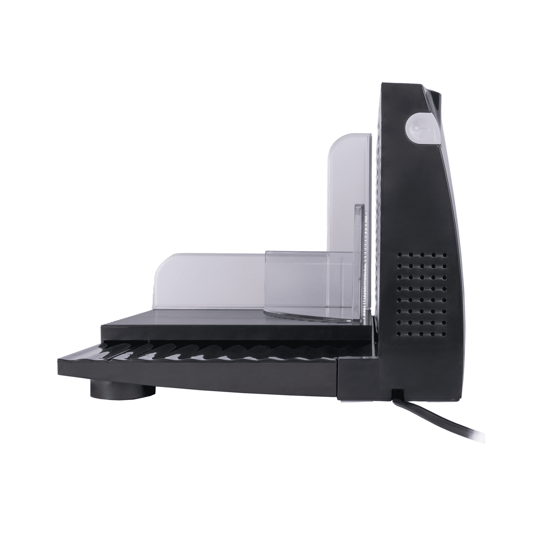Ein doppelter Sicherheitsschalter, leichtgängiger Schlitten mit Handschutz und Lebensmittelhalter sowie rutschfeste Gummifüße und eine Kabelaufwicklung sorgen für ein sicheres Schneideerlebnis und einen festen Halt während des Betriebs.