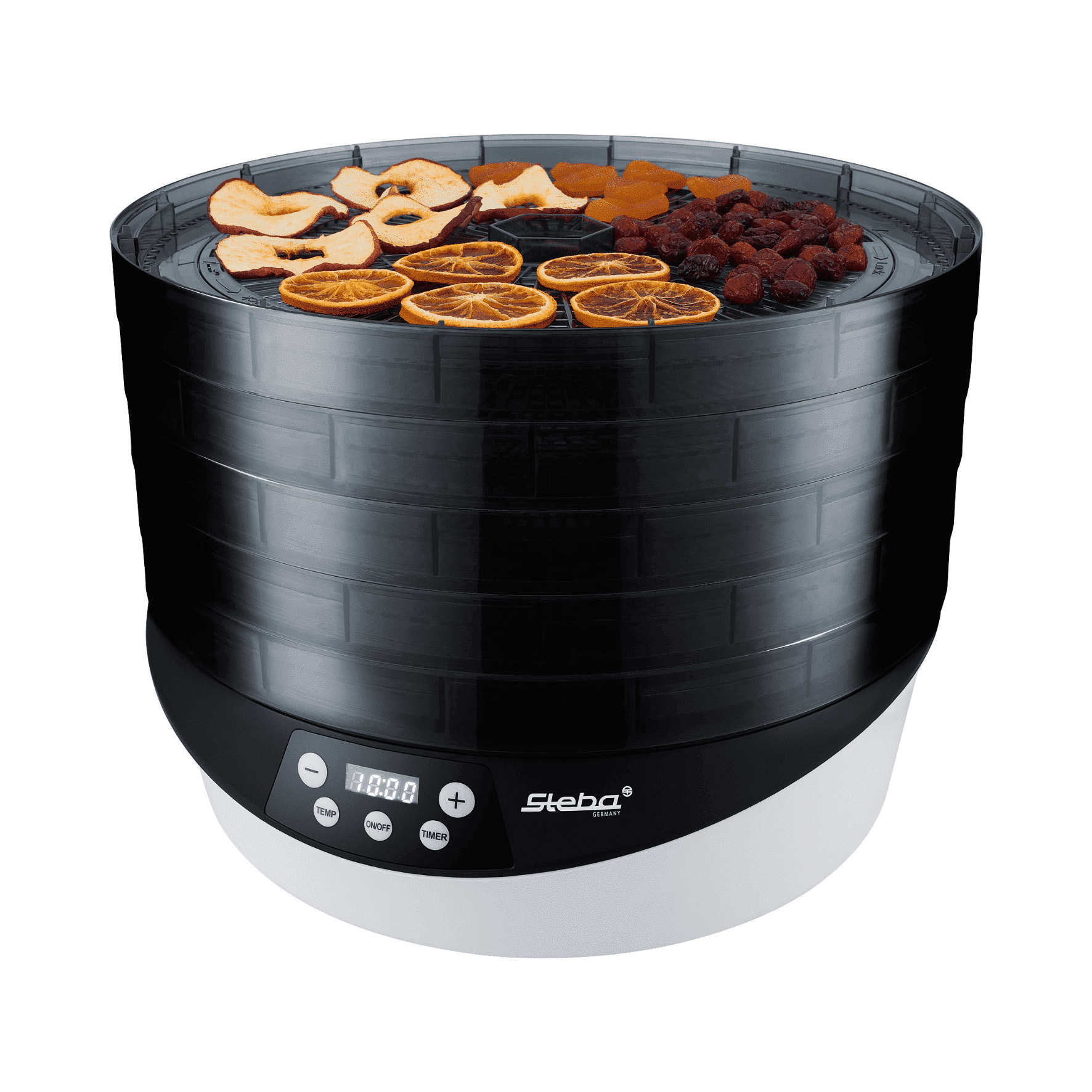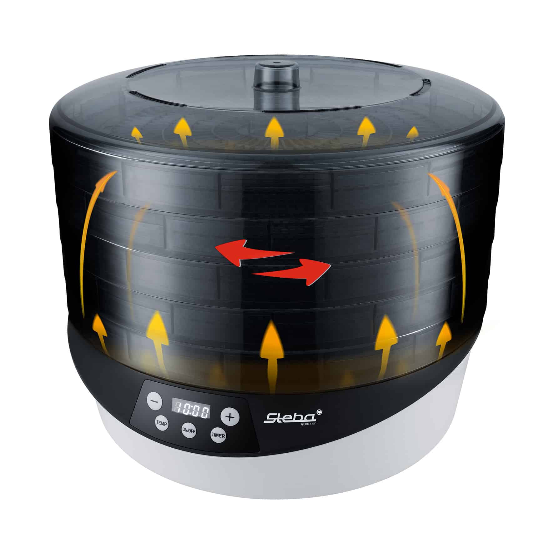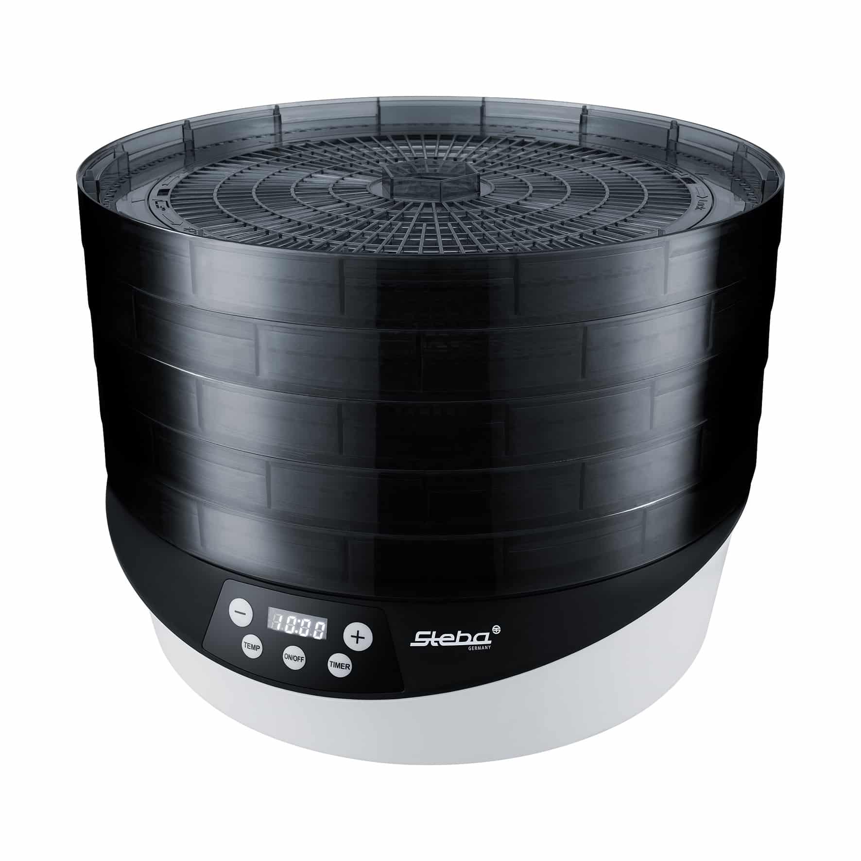 - Gleichmäßige und schnelle Trocknung durch 360° rotierende Dörretagen