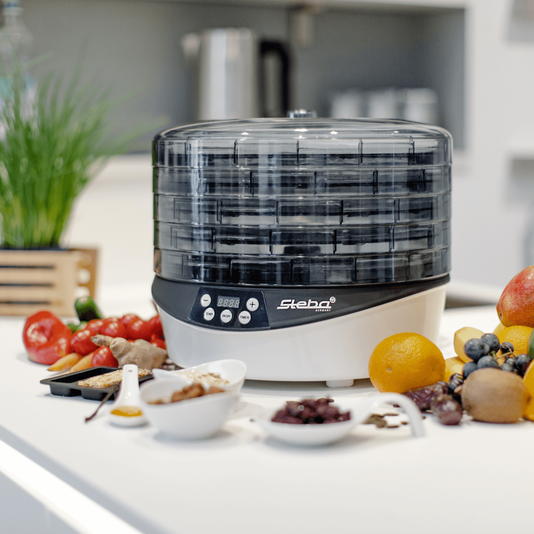 Der elektronische Dörrautomat ED 8 ist mit seinen 5 BPA-freien Aufsätzen mit einem Durchmesser von jeweils 32,5 cm ideal zum Dörren großer Mengen. Die Besonderheit: während des Betriebs rotieren die Aufsätze um 360°, dadurch wird eine noch gleichmäßigere und schnelle Trocknung gewährleistet. Mittels der elektronischen Steuerung lassen sich Temperatur (35 – 70°C) und Zeit (1 – 48 Stunden) problemlos einstellen. Ebenfalls im Lieferumfang enthalten sind eine Kräuterablagematte zum Trocknen von Gewürzkräutern, als auch ein Jelly-Einsatz der zur Herstellung von selber gemachtem getrockneten Fruchtpürees benutzt werden kann.