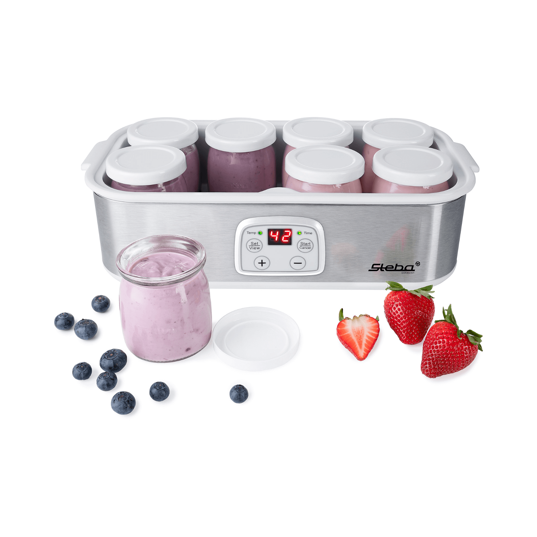 Selbst hergestellter Joghurt mit Früchten aus dem eigenen Garten schmeckt um ein Vielfaches besser als industriell gefertigter und ist in seiner Herstellung spielend einfach. Dafür sorgen der Timer mit Endabschaltung, die Betriebskontrollleuchte, sowie das LCD-Display. Aus der beigefügten Rezeptbroschüre entnehmen Sie viele leckere Ideen – ganz ohne Geschmacks- und Konservierungsstoffe. In den 8 leicht zu reinigenden Glas-Joghurtbechern mit Deckel lassen sich insgesamt 1,4 Liter Joghurt zubereiten. Dieser kann problemlos im Kühlschrank aufbewahrt werden und bereitet Ihnen auch in den nächsten Tagen noch Freude.