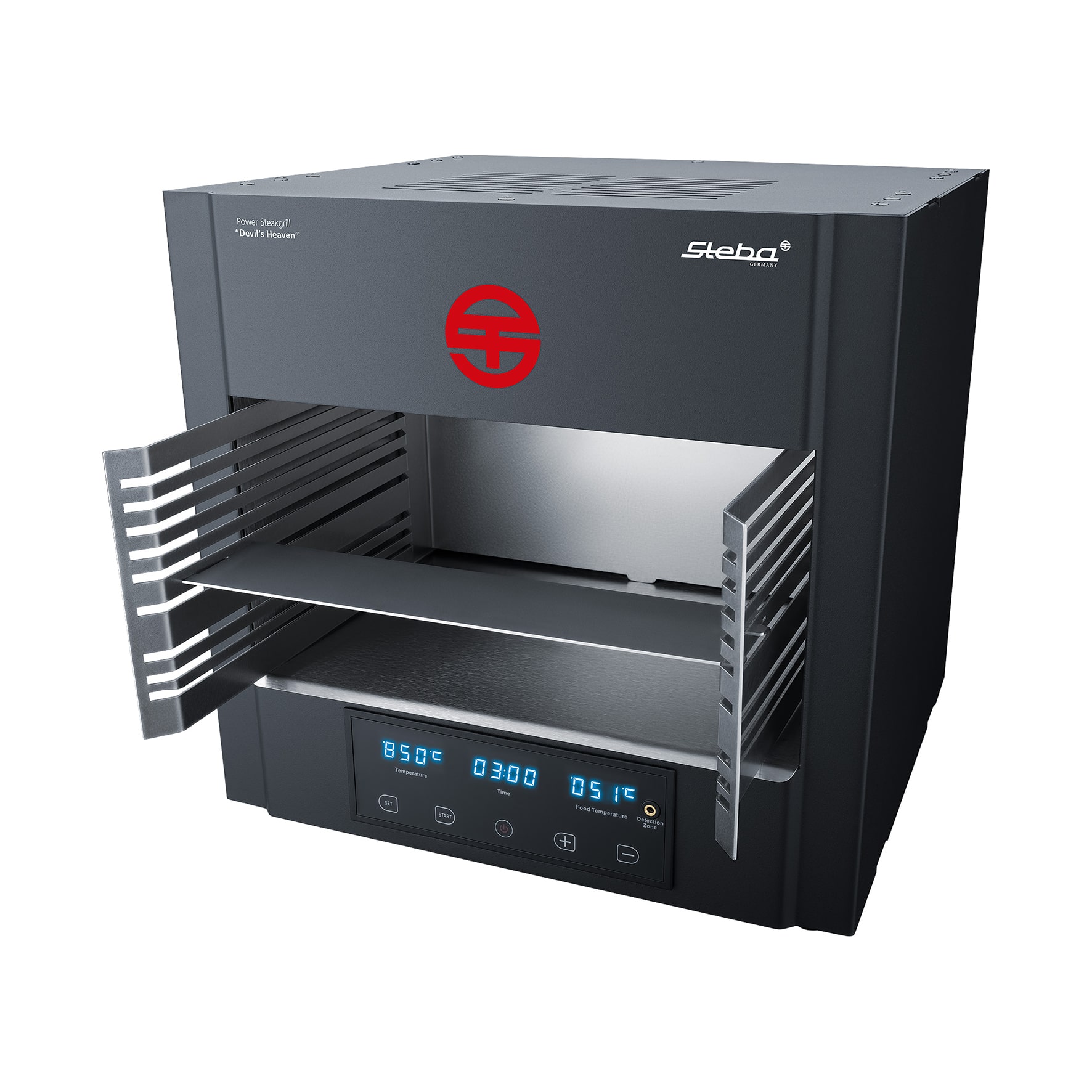 Ready for use spontaneously and without a long heat-up time, heavenly tender steaks, fish and other grilled food are cooked in the large cooking chamber at a devilishly hot 850°C. The intense heat causes the sugar on the surface to caramelise immediately and the grilled food gets a crispy crust with toasty aromas in minutes, while the inside still remains juicy and tender. Here, every steak is simply a delight!