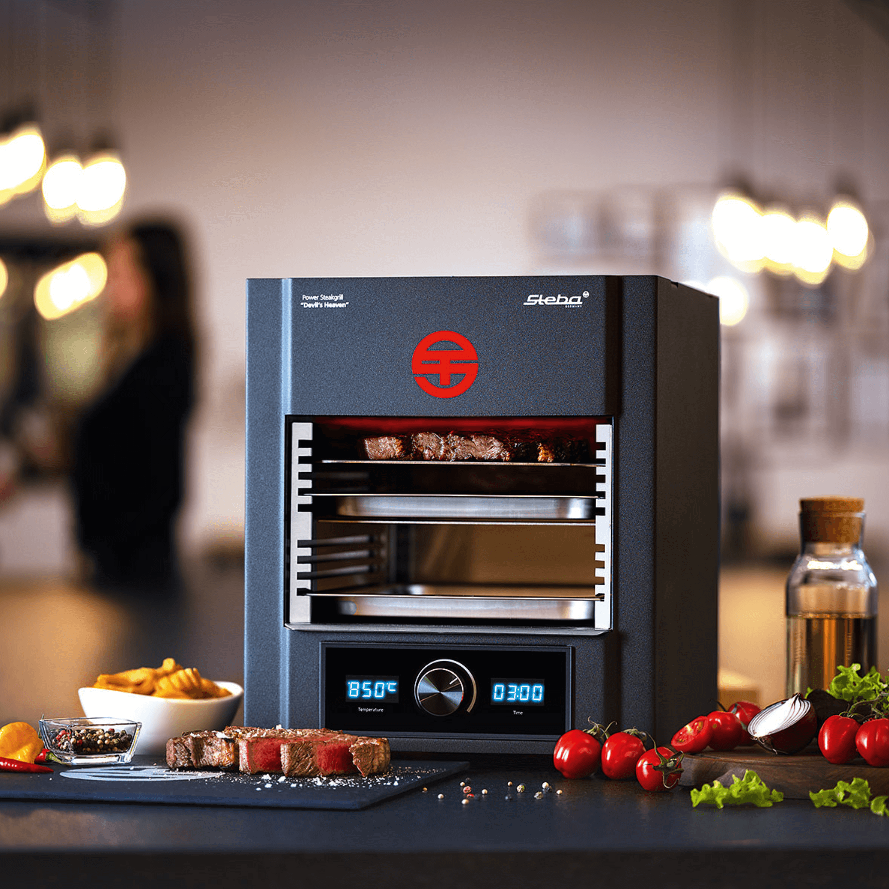 Der Power-Steakgrill PS M2000 „DEVIL’S HEAVEN” ist spontan einsatzbereit und ohne lange Aufheizzeit gelingen bei teuflisch heißen 850°C himmlisch zarte Steaks, Fisch und anderes Grillgut. Durch die intensive Hitze karamellisiert der Zucker auf der Oberfläche sofort und das Grillgut bekommt in Minutenschnelle eine krosse Kruste mit Röstaromen, während das Innere noch saftig und zart bleibt.