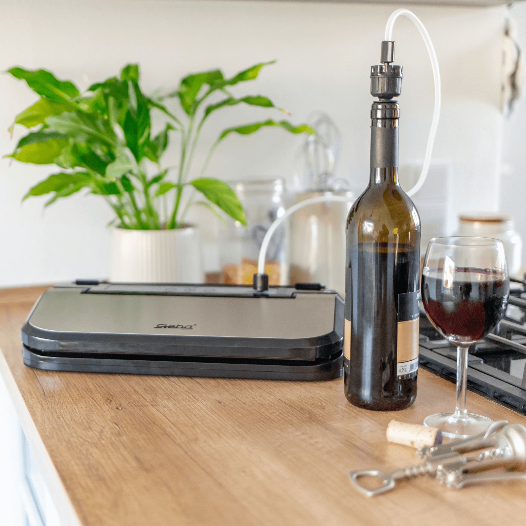 Alle Vakuumierer mit Schlauchanschluss und Vakuumierschlauch können diesen Weinstopper verwenden. Mit ihm kann Luft aus offenen Wein-, oder Saftflaschen gezogen werden um die Haltbarkeit des Inhaltes um ein Vielfaches zu verlängern.